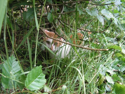 ze niet blij mee en schuilt hier onder de haag om het terras.