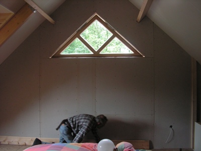 in onze slaapkamer. Na de isolatie (zie boven) is de gipsplaat aangebracht