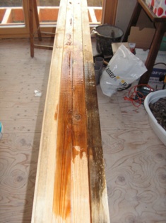 Nu we de tegelindeling weten kunnen we ook de plaats van de scharnieren voor de glazen douchedeur bepalen en daar een extra spantje in de gevel aanbrengen. De isolatieplaat die daar al is aangebracht eruit en... het is kletsnat erachter. We hebben de isolatie ergens in juni alvast aangebracht, maar nog niet de dampdichte laag omdat we er nog bij moesten kunnen. Dat blijkt dus niet te kunnen. Het vocht uit het huis gaat met het grootste gemak door de steenwolplaten heen en het water slaat neer tegen de koude vezelplaat aan de buitenkant. Water, schimmel, zwart, weer een tegenslag dus. Enige lichtpuntje is dat hetzelfde wellicht geldt voor het dak. Ook daar is de overgang tussen de polyurethaan-isolatieplaat en het zink de koudebrug waar eventueel vocht kan condenseren. Het is achteraf ook wel opvallend dat de lekkage pas begon in de koude periode begin december. Niet de beste week voor ons dus, al zijn we wel uit de details van de badkamer gekomen en kunnen we daar eindelijk mee verder volgende week. |