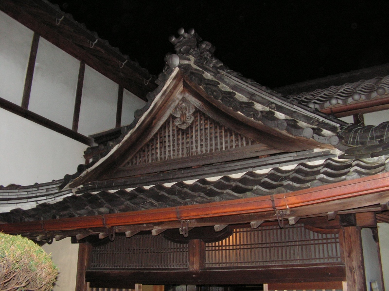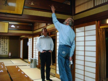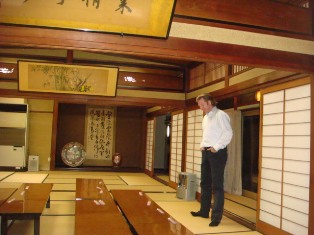 De tweede werkdag is ook naar behoren afgerond en na de eindbespreking nemen we afscheid van de begeleiders. Daarna gaan we nog eten in weer een bijzonder restaurant. Ook midden in de stad en in een huis waar vroeg in de negentiende eeuw de keizer heeft vertoefd tijdens zijn rondreis door het land. Japan bestond daarvoor uit afzonderlijke staatjes die toen verenigd werden onder de keizer. Een obelisk naast de ingang van het huis herdenkt dit bezoek. Het huis is een erkend monument en dat werkt ongeveer hetzelfde als hier. De eigenaar moet alles op orde houden, de staat betaald niets, maar je mag er ook niets aan veranderen. De foto's van de prachtige Japanse binnentuinen zijn geen van alle gelukt. Flitsen werkt niet en de verlichting zorgt voor overstraalde delen van de foto's zonder flits. Wel een mooie foto van de ingang kunnen maken.