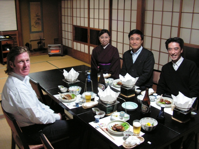 Om vijf uur zit Kaori Ito volgens afspraak in de hal op ons te wachten. Ze neemt ons met de auto mee naar het restaurant, wat ze vervolgens niet kan vinden. Flink gegiechel en bellen naar een collega helpt ons weer op het spoor. Traditioneel Japans restaurant. Op de kamer van het hotel was het bloedverstikkend heet, dus ik had mijn fleece in het hotel gelaten. In het restaurant is het heel erg koud 10° of zo... Ik de pest in. Schoenen bij de ingang in de kast en op kousenvoeten naar binnen. Een schuifpaneel van rijstpapier op latten gaat open en wij blijken een eigen eetkamer te hebben waar het heerlijk warm is. Om iets tegemoet te komen aan onze westerse stijve benen krijgen wij twee kussens om op te zitten, maar dat valt toch echt niet mee een hele avond! Kaori vertelt dat haar ouderlijk huis ook zo traditioneel gebouwd is. Om de aardbevingen te kunnen doorstaan hebben de huizen een houten structuur en de wanden zijn van rijstpapier. Vaak wel nog een gang tussen de kamers en de buitenkant, maar over het geheel genomen toch wel erg koud. Voor een Japanner is een warm huis daarom erg luxe en in alle restaurants staan er nu het winter is straalkachels om de temperatuur flink boven de 20° te brengen. Ik heb mijn fleece dus echt niet nodig! We bekijken de traditionele Japanse tuin, die heel wat uren onderhoud moet vergen. Na een eerste biertje later schuift Teramoto-san ook aan. Waar Kaori nog best last heeft met Engels spreken, spreekt hij behoorlijk goed Engels. Voor Japanse begrippen een onconventioneel man, die de kwaliteitsbaas is van Takata. En een echte bierliefhebber. Weet ook veel van Europese bieren en bestelt de een na de andere fles. Het is blijkbaar gewoonte om bij te schenken, zodra je een slok genomen hebt. En dat geldt ook voor de warme sake... Het eten is apart, maar echt heel lekker en wordt heel verzorgd op tafel gezet. Bij elke gang een andere stijl servies, maar allemaal even stijlvol en kunstig. Zowel het servies als het voedsel. Echt plaatjes eten dus. Het eten met stokje valt mij niet echt gemakkelijk, maar er is alle tijd en het zijn maar kleine hapjes. Na ik denk wel vijf voorgerechten wordt het hoofdgerecht met een flinke kom rijst geserveerd. Daarna nog een toetje en dan wordt het tijd om op te stappen. Ik heb echt moeite om te staan, maar krijg al gauw weer een normaal gevoel in mijn benen. Hoewel ik eigenlijk al genoeg gedronken heb, vind Teramoto dat er echt nog een afzakkertje nodig is. Hij weet wel wat en daar lopen we heen. Halverwege worden we begroet door een dame in een BMW?, die vervolgens doorrijdt. Ze blijkt te zijn opgetrommeld om ons nog een drankje te schenken. Als we even later bij de kroeg aankomen, blijkt die nog niet open te zijn. We delen daarom in het eettentje op de begane grond daarom eerst nog een fles bier aan de bar. Even laten kunnen we naar boven en worden door de Koreaanse gastvrouw ontvangen. Het is al een beetje warm, er is muziek en een volle fles whisky die nog op moet... Na kennismaking met onze gastvrouw, die Teramoto blijkbaar goed kent en een eerste drankje komen er microfoons op de bar. Het blijkt dus een karaoke bar te zijn. Teramoto kan echt best goed zingen. Een paar nummers alleen en een paar samen met de gastvrouw die ook echt een goede stem heeft. Heel vriendelijk worden wij overgehaald om het ook maar eens te proberen. Zij weet wel een paar nummers, die we vast wel kennen. Bridge over troubled water van Simon and Garfunkle, een kerstliedje en wat van Abba. Jan kent heel veel muziek, maar vooral Abba valt erg tegen. Het refrein is heel bekend, maar de tekst is vaak gesproken en de tekst van de computer lijkt niet altijd helemaal bij te zijn. De gastvrouw helpt waar nodig wat mee en de sfeer is prima. Zij is nu 17 jaar in Japan, vrijgezel, en rijk, vindt alle mannen hetzelfde en Jan een playboy. Het is een leuk mens, maar met die instelling zal ze nog wel een tijdje vrijgezel blijven. Dat zou met haar uiterlijk niet hoeven zou ik zo zeggen. Zelfs Kaori wordt overgehaald om wat te zingen. Welk nummer? Opzoeken in het boek. Een soort dubbele gouden gids en wel 7 cm dik. Meer dan 1200 bladzijden met lijsten muziek. Code invoeren op een paneel of met de afstandsbediening en de muziek wordt via internet opgehaald en met bijpassende film afgespeeld. Ongekend! Jan ziet nog een nummer dat pas een maand uit is. Jawel, het boek is van november en wordt maandelijks vervangen. Ik zou het nooit van mezelf gedacht hebben, maar ik heb een prima avond. Als de whisky bijna op is, is het mooi geweest. We gaan alle vijf tegelijk weg. Kroeg op slot. Op de hoek van de straat staat een taxi klaar om ons om naar het hotel in Hikone terug te brengen. Jan vindt dat je hier niet geweest kan zijn zonder een bezoek aan de Bamboo-bar om de hoek. Ook daar nog een paar biertjes en een Koreaanse sake. Niet helder zoals de Japanse, maar ongeveer als Pernod met water. De smaak is ongeveer gelijk. In de bar goed aanspraak met het stel achter de bar en de twee andere gasten die er al zaten. Om één uur in bed en ondanks de hitte in de kamer en de herrie van de luchtverwarming val ik als een blok in slaap. Als dat maar goed gaat morgen.